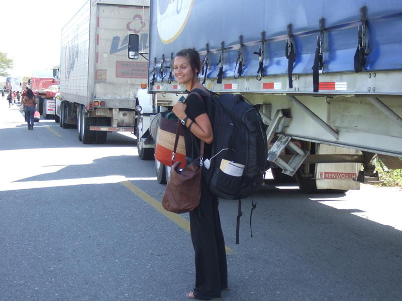 When these photos were taken on Tuesday, November 16, the seventh day of the blockade, the road had been closed since 8 pm on Monday. Traffic was later allowed to procede for around an hour, starting at 1 p.m. The drivers seemed to take the delay in stride. The local people brought them food and water, and they rested or socialized in the shade of their trucks. There were even porta-potties. Airport vans from Huatulco were able to leave passengers on one side of the barricade to be picked up by another van on the other side. Other travelers took local buses and then had to walk a few hundred meters to wait for another bus.