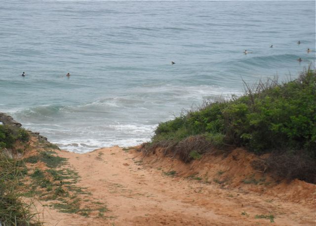 The dirt road across from the airport entrance, leads to both the city’s main sewage treatment plant and to the beach at the end of the point. The sewage plant is on the west side of the cape, below it is a polluted lagoon that is still the home of crocodiles, and below that is the beach. Because of its unique wave, this is a favored spot for some of Puerto’s body boarders.