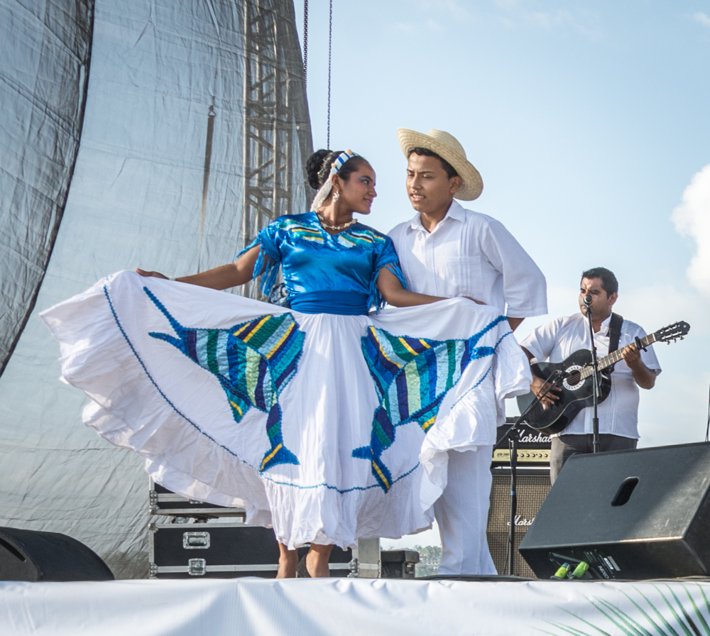 The costumes of the dancers vary, but the men tend to wear white shirts and trousers, a straw hat, and a bandana. They wave a handkerchief to mark their movements. The women dress in white blouses embroidered with beads. Wide, ankle or calf-length skirts of different colors are embellished with lace and ribbons with a silk kerchief in the waistband.