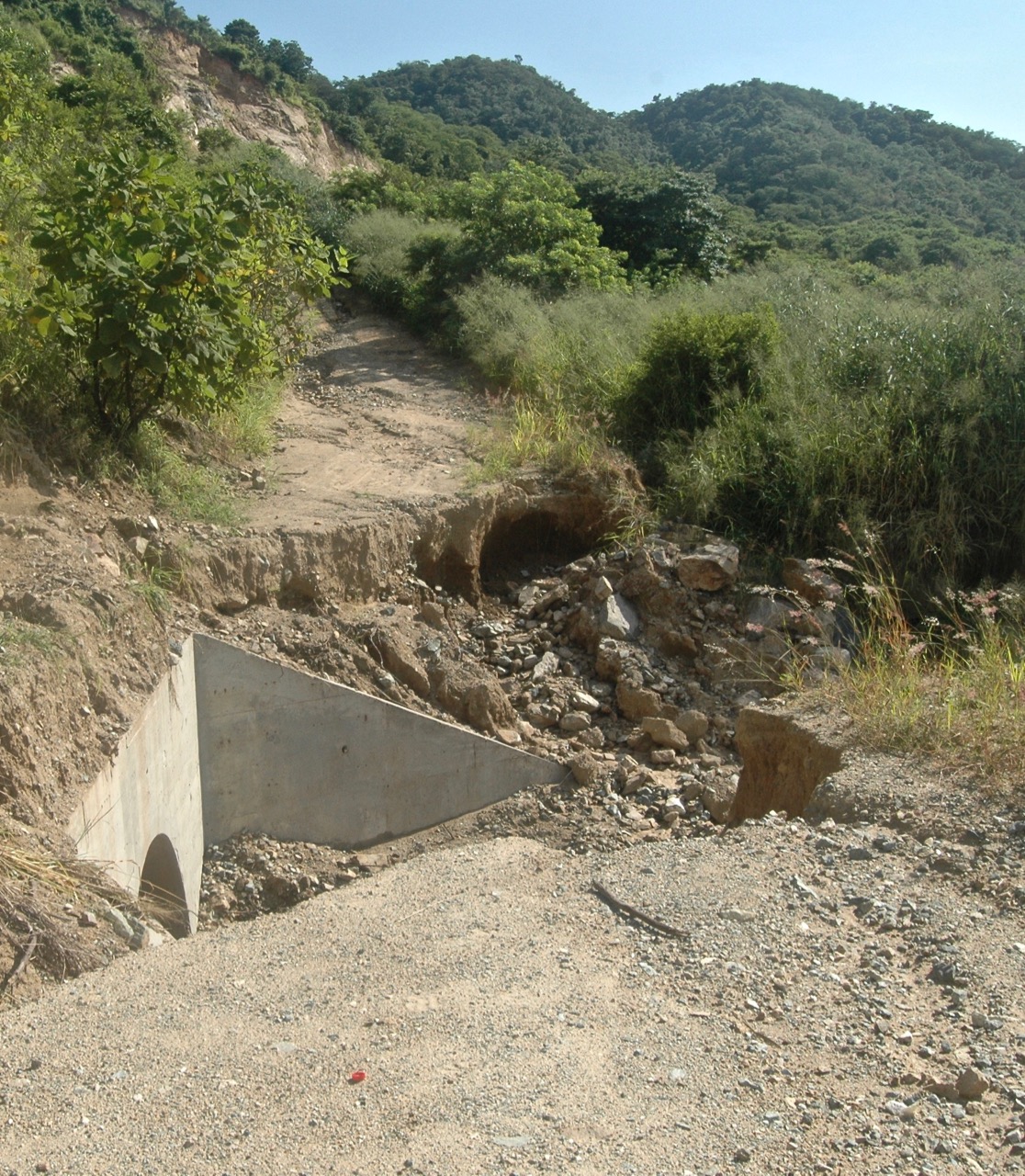 On September 21 we rented a jeep with 4-wheel drive from Tres Reyes intending to get as far as the almost completed Santa Martha tunnel at the northern limit of Colotepec, 30 km from where the highway begins in Ventanilla. I was imagining cave-ins, bats, dead animals… But the trip ended ten km south of the tunnel, at the detour around the still incomplete Atotonilco bridge; the culvert that had supported the road was washed away by this summer’s rains, leaving an impassable gap. It would have taken at least three hours — via Santa Catarina Loxicha and San Antonio Lalana — to get to the other side. Later we heard that the section of the highway between Atotonilco and Santa Martha had suffered serious landslides.
