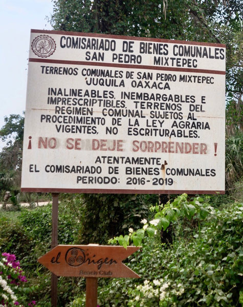You can’t get an acta for this beachfront property, but that has not stopped people, like the owners of Origen Beach Club, from building on it. They claim the land is private. Having an escritura (clear title) on a property is not proof of ownership of communal land. The land in Chila, including Palmarito, was not included in the federal expropriation of 1970. There is even a sign at the entrances to Agua Dulce and Palmarito warning you that the land is communal.