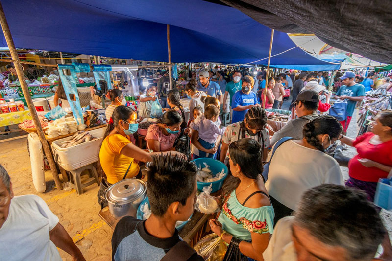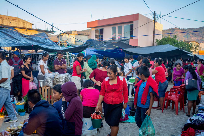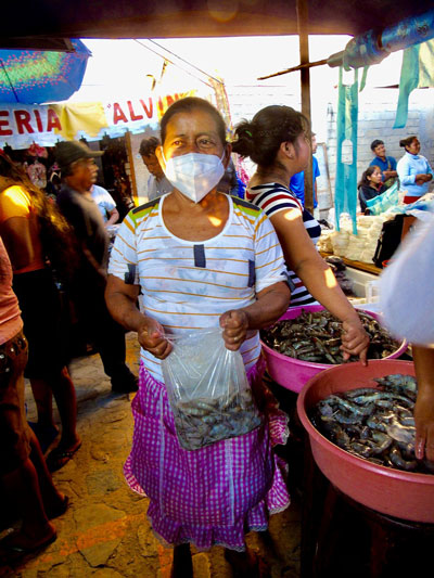 DEFINITELY OFF THE BEATEN TRACK, YET THE ROAD connecting it to the Coastal Highway is well paved, Santo Domingo de Morelos, the capital of the mostly rural, Zapotec municipio, is the site of the early Sunday morning market called la plaza. It is here that local farmers bring their produce and do their shopping . But it also attracts fish mongers from Las Negras, on the shore of the Manialtepec Lagoon, and from Puerto Angel.