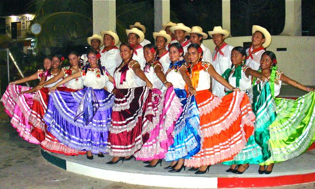 The costumes of the dancers vary, but the men tend to wear white shirts and trousers, a straw hat, and a bandana. They wave a handkerchief to mark their movements. The women dress in white blouses embroidered with beads. Wide, ankle or calf-length skirts of different colors are embellished with lace and ribbons with a silk kerchief in the waistband.