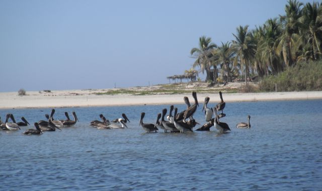 The Manialtepec Lagoon is a lake fed by the Manialtepec River for most of the year. In the rainy season, however, it becomes a tidal estuary of the Pacific Ocean. There are two barrier beaches that separate the lagoon from the sea: one, called the Barra, is at the south-west corner at the tip of El Palmarito beach; the other, Barrita, is where the Manialtepec River delta begins, a few hundred meters west of Puerto Suelo.