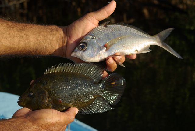 When the barrier beach falls the level of the lagoon falls with it, even though the fresh water is partially replenished by the salt water of the sea. This is when the fishermen get their biggest hauls, trapping ocean fish in La Barra their nets. It is also when the lagoon’s giant shrimp go out to sea to spawn. Snook (robalo), mojarra, and red snapper (pargo) are coastal fish that also live in the lagoon.