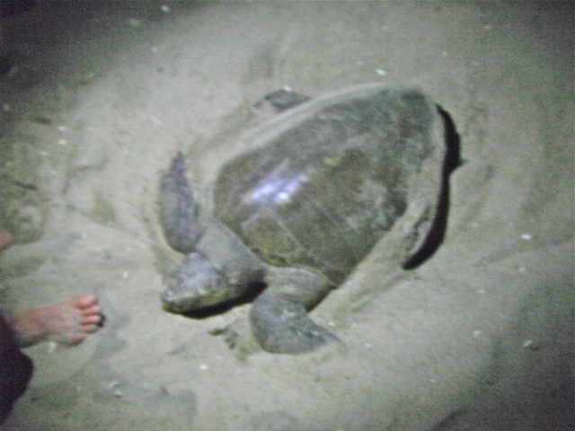 The olive ridley marine turtles, to give it its proper name, live in the ocean where sharks are their only predators. But between July and December the females return to the beach where they hatched to lay their eggs. Hundreds or thousands will assemble for days in the waves just off shore and then, receiving some mysterious signal – usually on a night without a moon - make a mad scramble on to the sand. Forty-five days later the eggs will hatch. Although some olive ridleys lay their eggs in solitary places, most join the arribada.